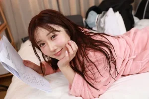 撮影後にバスローブ姿でベッドで休憩しているひびきさんに近寄る。竿を差し出して、まだ物足りないことを伝えると嬉しそうに触ってくれる。濡れ髪を使ってくすぐたい手コキも。